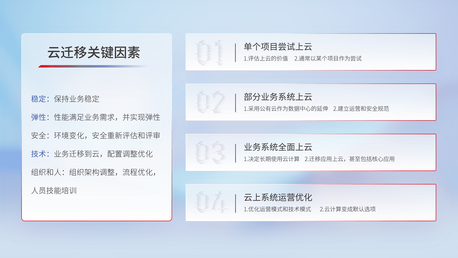 结合实际业务,,从规划设计、、云平台选型、、云原生改造、、、、数据迁移、、、、集成交付,,,,迁移全过程为客户识别最佳上云路径,,,做好风险识别管理,,,,设计网络架构、、、、身份权限、、安全审计合规、、操作审计、、、、日志审计、、监控告警策略、、多站点容灾设计等,,,,对云上基础设施进行整体规划,,,提升IT治理水平,,,以满足弹性、、高可用、、、、高性能的需求。。。。
