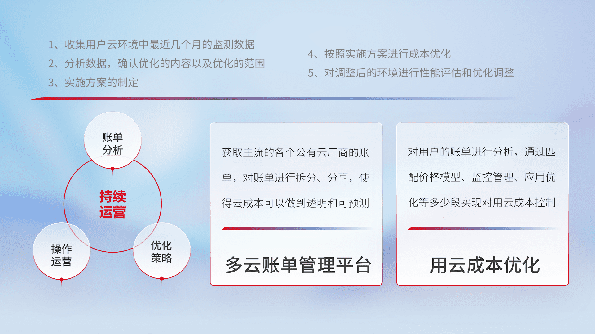 通过多云纳管,,,,以统一的资源数据模型把客户的云资源进行抽象和封装,,进而实现对多云资源的统一操作,,,保障云资源管理的可靠性、、、、稳定性与可用性。。。。量身定制化运维内容,,,配置、、开发运维、、补丁管理、、、、备份、、、监控、、认证和访问管理、、审计和日常巡检等,,,保障在用云过程中的可靠度,,,稳定度以及高可用率。。。。